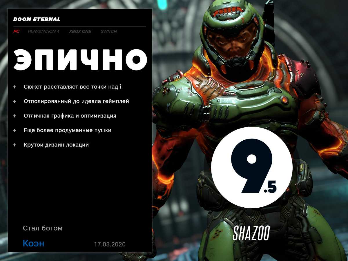 Doom Eternal выходит 20 марта на PC, PS4, Xbox One и Stadia. Позже игра станет доступна на Nintendo Switch.